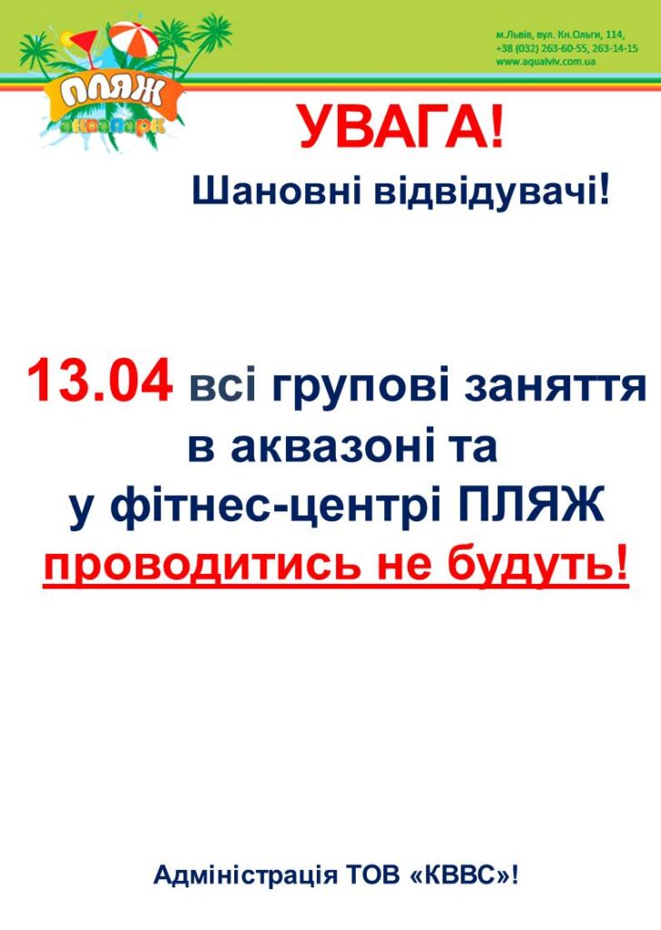 Posted in Новини13.04.2026 всі групові заняття в Аквазоні та у фітнес-центрі ПЛЯЖ проводитись не будуть! By Aquapark Lviv07.04.2026 Posted in Новини