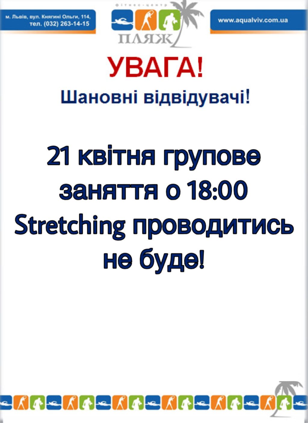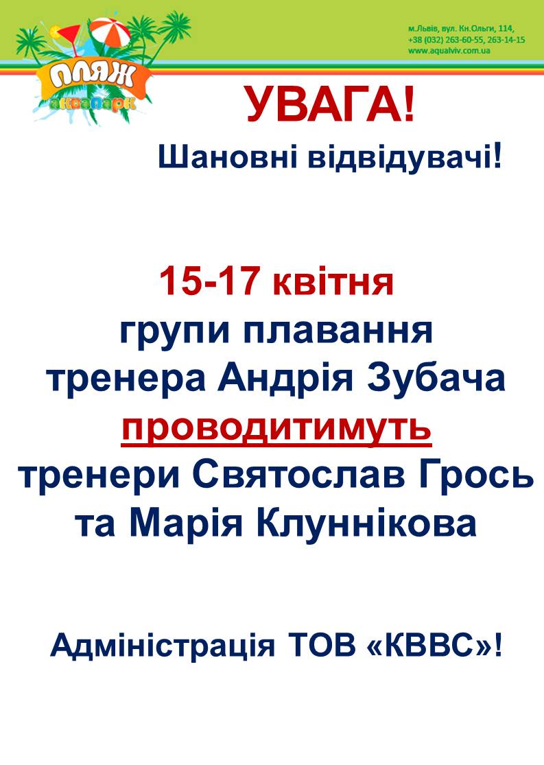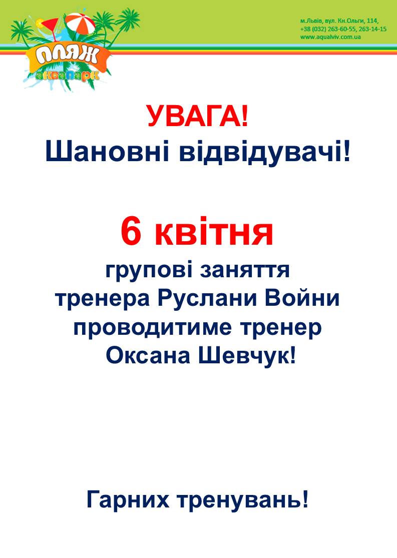 Posted in Новини Posted in Новини13.04.2026 всі групові заняття в Аквазоні та у фітнес-центрі ПЛЯЖ проводитись не будуть! By Aquapark Lviv07.04.2026