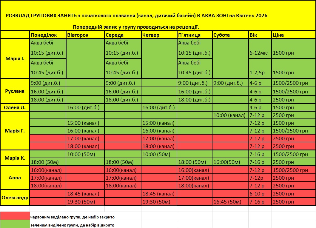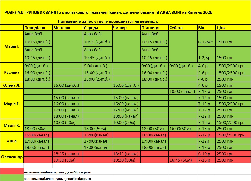 20-25 квітня (включно) групові заняття початкового плавання з КАНАЛУ переносяться на 50-ти м спортивний басейн, окрім групи на 18:00. Група канал о 18:00 проводитись не буде!