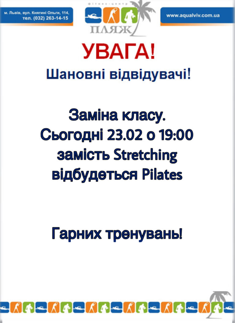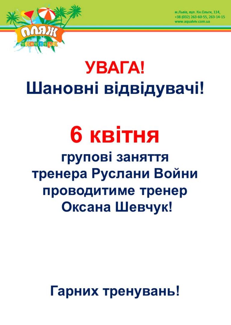 Новини 13.04.2026 всі групові заняття в Аквазоні та у фітнес-центрі ПЛЯЖ проводитись не будуть! Детальніше » 07.04.2026